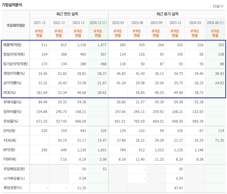 최근 3년 실적을 보면, 매출액 및 영업이익과 당기순이익이 모두 개선되는 모습을 보여주고 있습니다. 올해는 전년도 보다 매출액 및 영업이익과 당기순이익이 증가하는 전망치가 나와 있습니다.