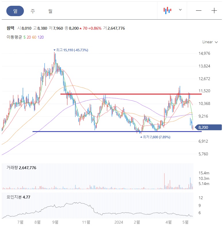 주가가 박스권에서 고점과 저점을 지키고 있습니다. 이번에도 저점에서 지지를 받아야 하는 자리입니다. 예전과 다른 점은 거래량이 동반된 움직임을 보여주고 있습니다.