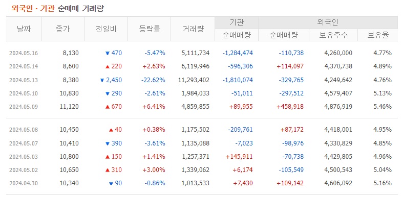외국인보유주식수 : 4,260,000 주 (4.77%)