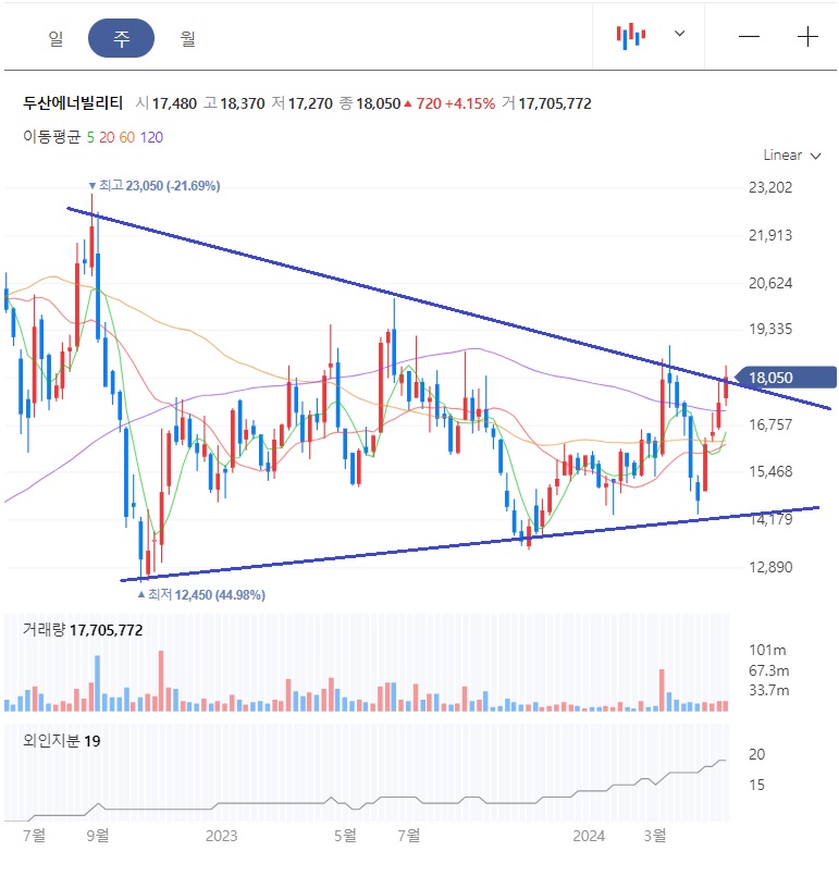 고점 및 저점의 추세를 지켜가면, 주가는 수렴구간에서 급등을 보여주게 됩니다. 외국인 물량도 올해 들어서 꾸준히 유입되고 있습니다.