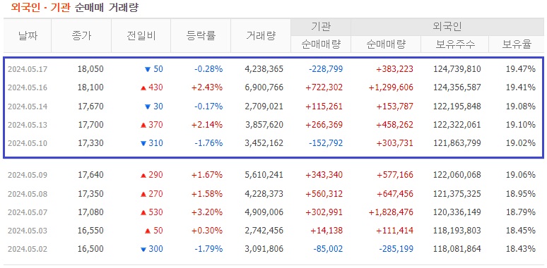 외국인보유주식수 : 124,356,587 주 (19.41%)