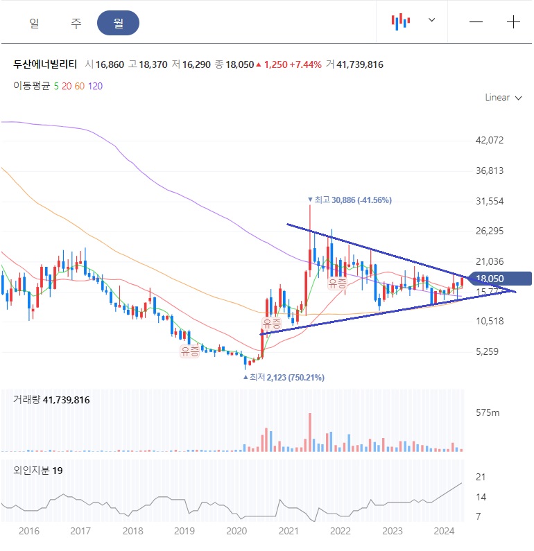 월봉 60일선이 추세 하락에서 가로횡보를 거쳐서 우상향 전환 중입니다. 저항선에서 지지선으로 지지여부 확인을 보여줬습니다. 월봉 120일선도 돌파를 하면서, 가로횡보를 통한 지지여부 확인을 2021년부터 지금까지 고점은 낮아지고, 저점은 높이면서 응집되는 모습을 보여줬습니다.