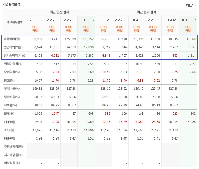 올해(2024년)는 매출액 및 영업이익은 소폭 감소하지만, 당기순이익은 개선됨을 전망하고 있습니다. 올해 1분기 실적에서 전년도 보다 개선된 모습을 보여주지 못하면서, 주가도 힘을 받지 못하고 있습니다.