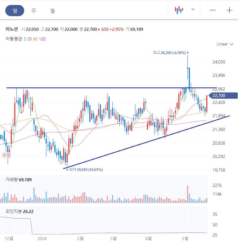 주봉상 2023년 7월에 최저점 18,600원을 찍고는 저점을 높이면서 주가가 우상향하고 있었고, 최근에 전고점을 돌파하는 긍정적인 흐름을 보여줬습니다.