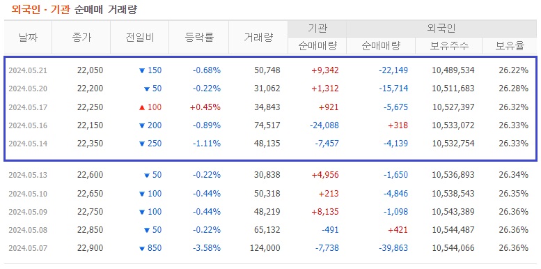 외국인 보유주식수 : 10,489,534 주 (26.22%)