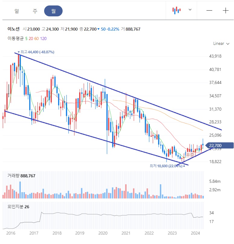 주봉상 2023년 7월에 최저점 18,600원을 찍고는 저점을 높이면서 주가가 우상향하고 있었고, 최근에 전고점을 돌파하는 긍정적인 흐름을 보여줬습니다.