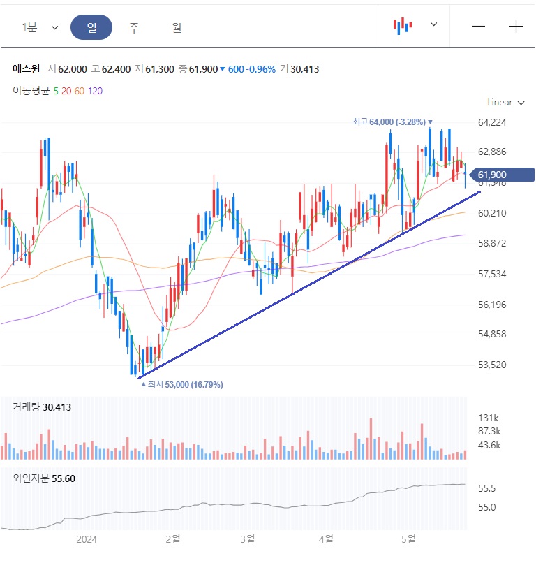 1월에 53,000원 저점을 찍고는 저점을 높이면서 주가가 상승하고 있습니다. 일봉 20일선, 60일선, 120일선이 모두 우상향 전환한 만큼 지지선을 확인 하셔야 합니다.