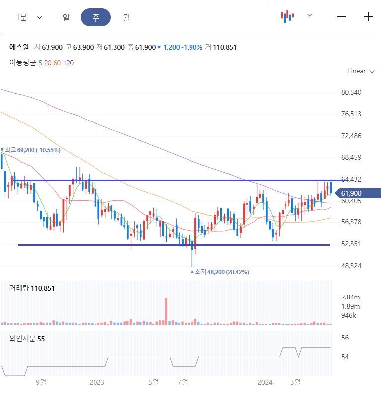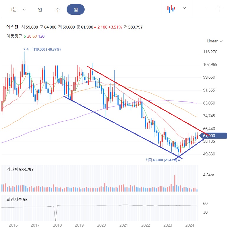 2016년 고점 116,500원을 찍고는 가로횡보 조정 이후에 추세 장기 하락으로 주가 하락을 하였습니다. 월봉 20일, 60일, 120일을 모두 붕괴하는 약세를 보여주면서, 2019년 부터 2023년까지 4년동안 주가가 하락조정을 받았습니다. 그사이에 월봉 20일선의 저항선이 낮아지면서, 최근 돌파를 하였고 저항선에서 지지선으로 전환되었습니다.