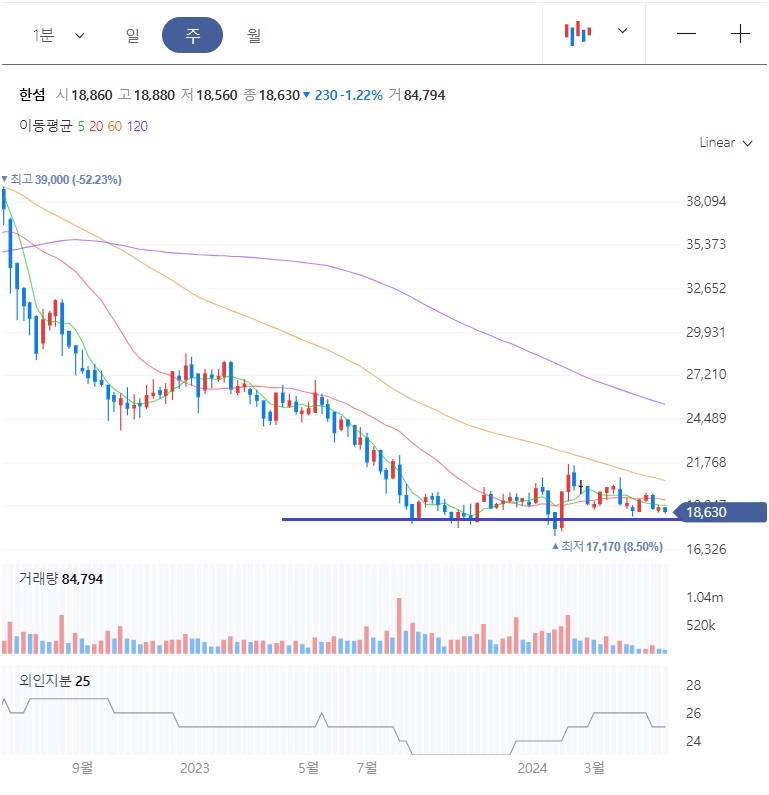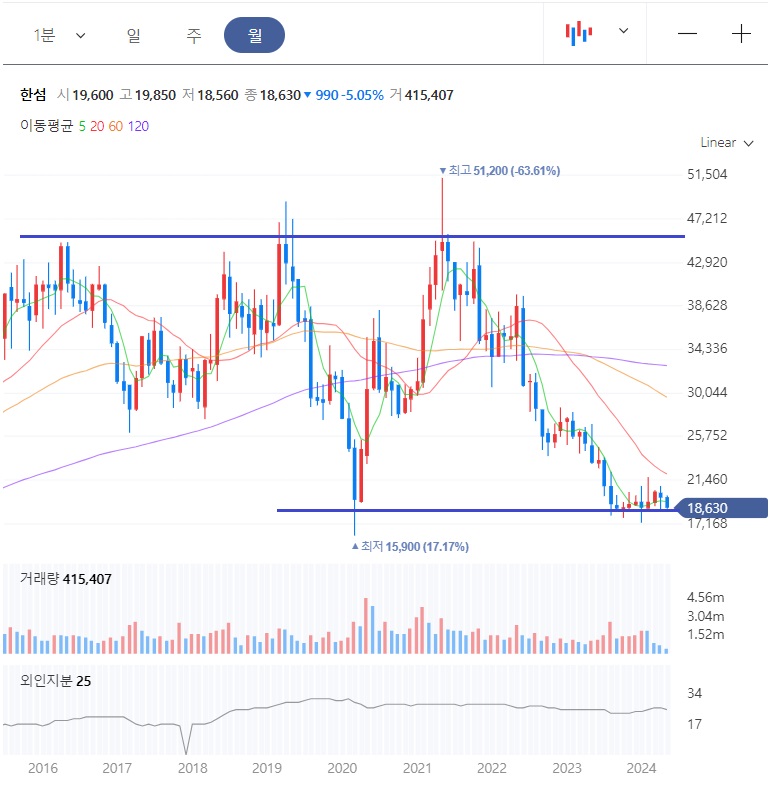 2021년 고점 51,200원을 찍고는 4년동안 주가가 하락조정을 받고 있습니다. 9개월동안 저점에서 지지여부 확인 구간 입니다. 그사이에 월봉 5일선이 가로횡보 로 바닥을 다지고 있고, 월봉 20일선을 기다리고 있습니다.