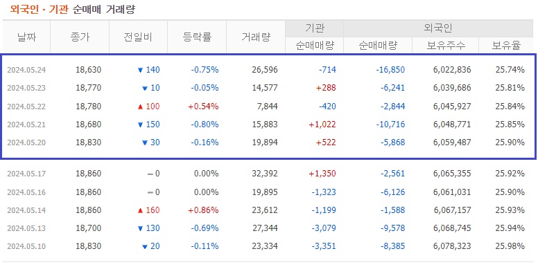 주가가 거래량이 미비하고, 하락조정 국면이지만, 외국인 물량은 소량 증가하였습니다.