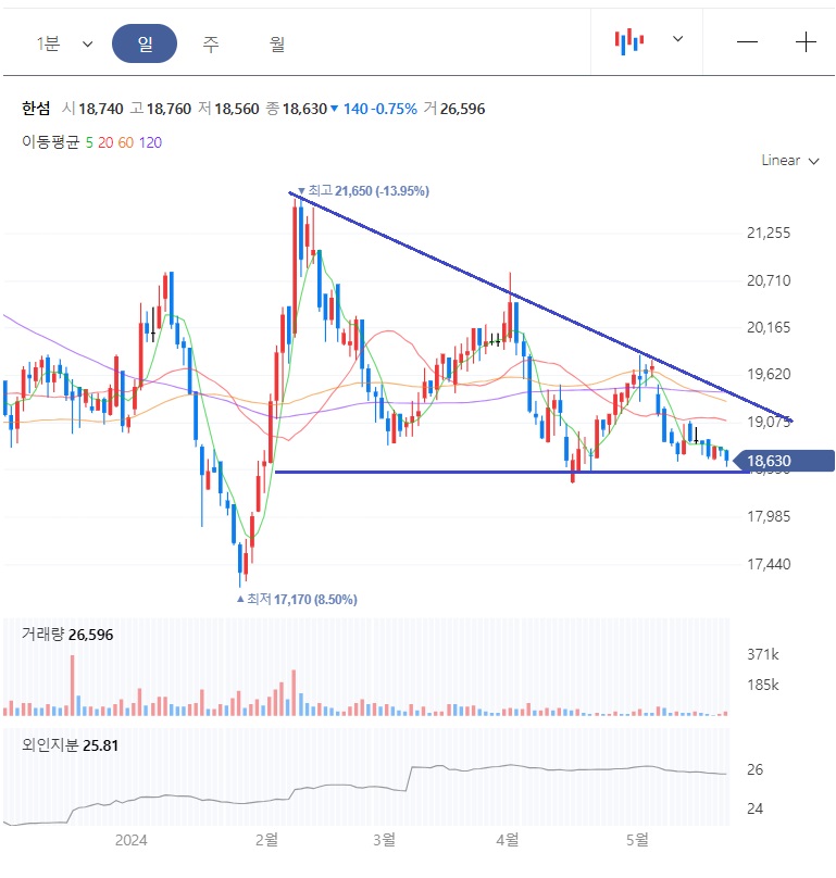1월에 저점 17,170원을 찍고는 급반등을 보여주면서, 고점 21,650원까지 반등하였지만, 상승폭을 반납하면서 지금까지 저점을 낮춰 가고 있습니다.