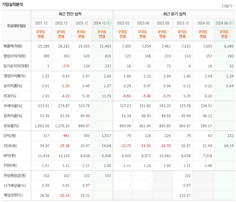 최근 3년 실적을 보면, 매출액은 매년 성장하고 있음을 알수 있습니다. 2022년에 영업이익이 감소하고, 당기순이익은 적자전환하는 약세를 보여줬다가 2023년에 흑자전환하면서 개선되는 모습을 보여줬습니다. 올해 예상치는 매출액 및 영업이익과 당기순이익이 모두 개선됨을 기대하고 있는 만큼, 주가 상승의 모멘텀으로 볼수 있습니다.