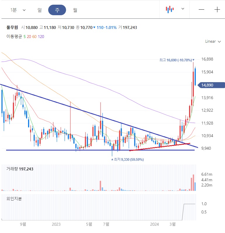 저점에서 지지를 받으면서, 고점이 낮아지는 구간을 1년 이상 진행을 하다가, 올해 4월에 급등세를 보여주고 있습니다. 주봉 60일선 및 20일선이 수렴하는 구간에서 반등이 나와줬고, 주봉 120일선도 돌파하는 강세를 보여줬습니다. 지난 3개월동안 거래량이 엄청났음을 알수 있습니다.