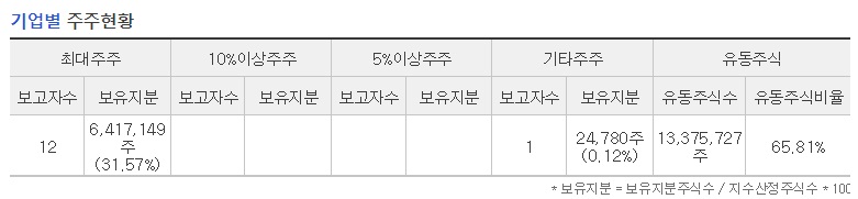 상장주식수 ( 20,323,614 주 ) - 주요주주 ( 7,197,599 주 ) = 13,126,015 주