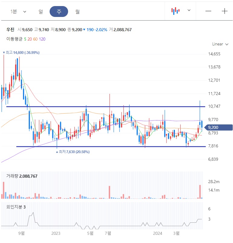 2020년에 저점 2,540원을 찍고는 주가가 급등세를 보여주면서, 2022년에 고점 16,300원까지 상승을 보여줬습니다. 그 이후에 지금까지 하락조정을 보여주고 있고 저점에서 지지를 받으면서 고점이 낮아지는 모습을 보여주고 있습니다.