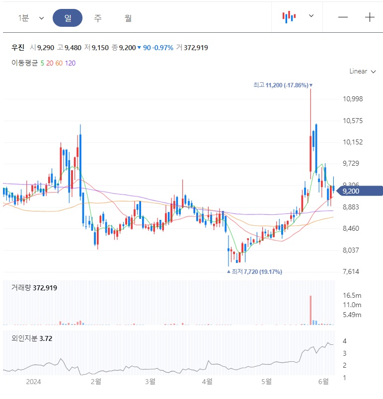 특히, 5월 27일에 유통가능주식수 보다 많은 1,646만주가 거래되면서 12% 급등을 보여줬습니다. 주가 상승 추세 전환의 신호가 나온 만큼, 반등추세 전환이 이뤄지는지 확인 하셔야 합니다.