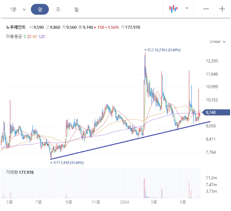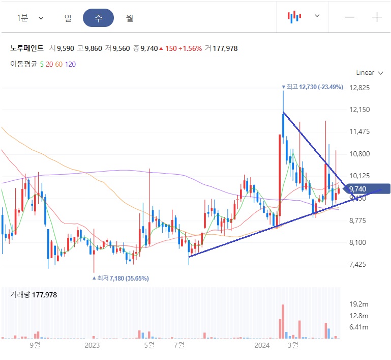 7,180원대에서 저점을 다지면서 가로 횡보를 보여주다가, 2023년 7월 저점을 찍고는 주가가 우상향 보여주고 있습니다. 저점을 높여가고 있고, 저점은 주봉 60일선과 수렴하고 있습니다. 주봉 60일선이 추세선이기에, 꼭 체크해야 합니다.