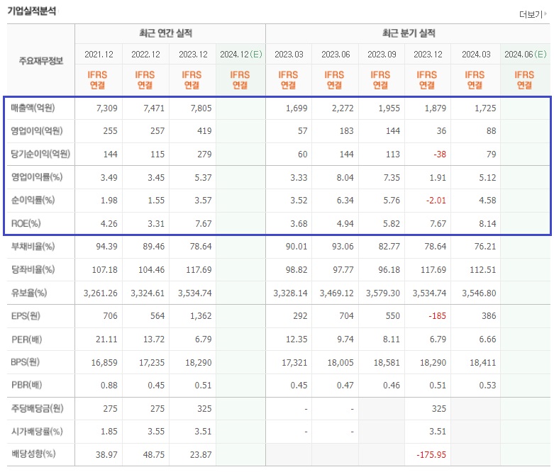 최근 3년 실적을 보면, 매출액이 완만하게 성장을 하였고, 영업이익도 매출액에 따라서 개선되는 모습을 보여줬습니다. 2022년에 당기순이익이 소폭 하락하였지만, 2023년에 다시 개선되는 모습을 보여줬습니다.
