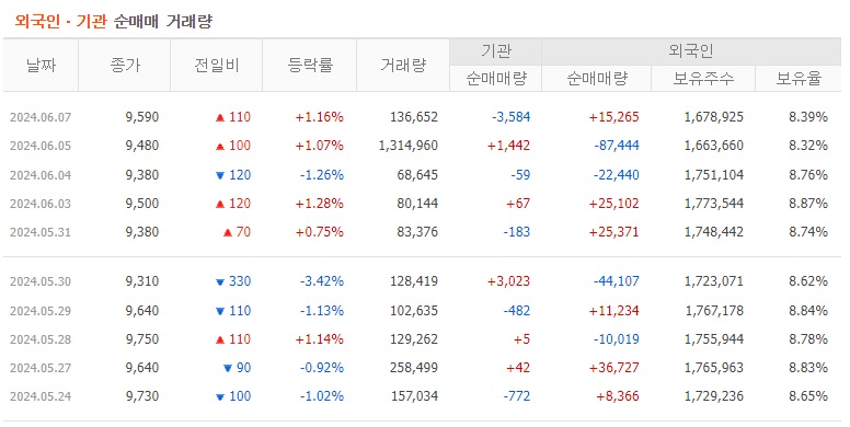 2023년 8월에 저점 7,410원을 찍고는 지금까지 저점을 높이면서 주가가 우상향을 보여주고 있습니다. 2월에 고점 12,730원을 찍고는 지금까지 하락조정을 받고 있지만, 저점의 추세는 지켜지고 있고, 간간히 거래량이 실린 움직임이 나오면서, 물량 테스트를 하고 있습니다.