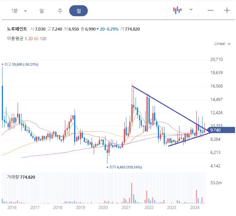 현재 월봉 120일선에서 지지여부 확인 구간이고, 월봉 5일선, 20일선, 60일선, 120일선이 모두 수렴하는 구간에 진입하면서 조만간 다시 방향성을 보여주게 됩니다.