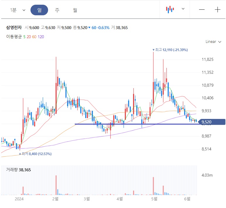 2023년 하반기에 저점 7,800원을 찍고는 급반등을 보여주면서, 고점 12,100원까지 상승을 보여줬다가, 현재는 상승폭 반납하면서 바닥을 확인 하는 구간 입니다.