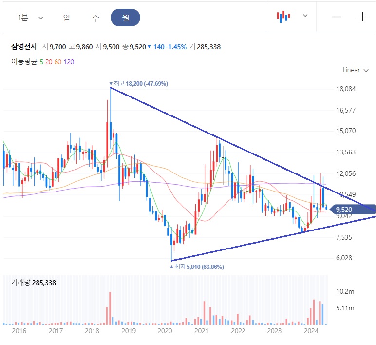 2020년에 최저점 5,180원을 찍고는 주가 급반등을 보여주었고, 지금까지 하락추세를 이어가고 있습니다. 고점은 낮아지고 저점은 높아지는 구간임을 알수 있습니다.