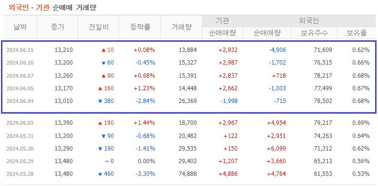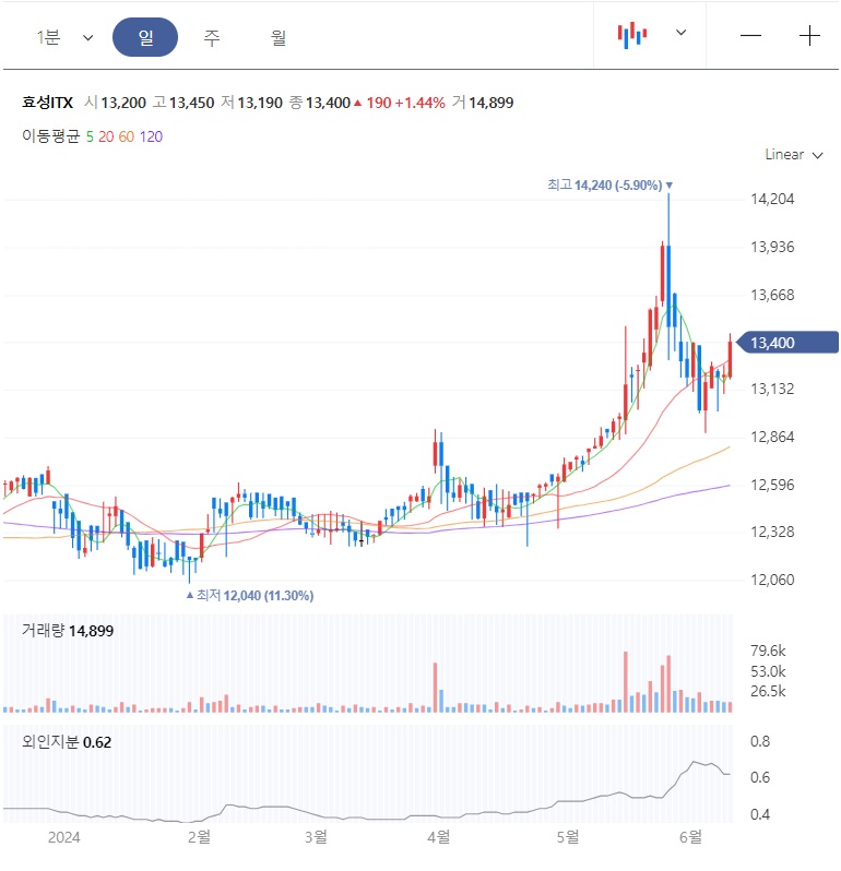 저점을 높이면서, 주가가 상승하고 있고, 5월 말에 고점 14,240원까지 반등하고는 조정을 받고 있습니다.