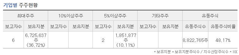 5%이상 주주 : 1,851,877 주 (10.11%)