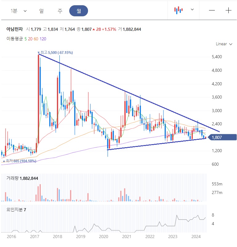 2017년에 고점 5,500원을 찍고는 주가가 지금까지 하락조정을 보여주고 있습니다. 반등시도가 매년 있었지만, 고점이 낮이지면서 추세는 여전히 하락임을 알수 있습니다.