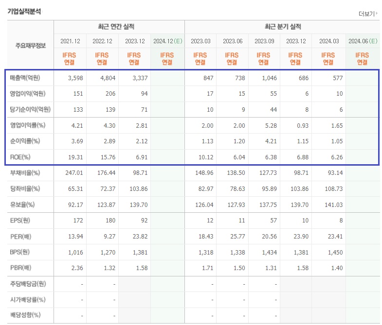 최근 3년 실적을 보면,  2022년 매출액 및 영업이익과 당기순이익 최고치를 찍고는 2023년에 매출도 감소하고, 영업이익 및 당기순이익도 크게 감소하는 모습으 보여줬습니다.