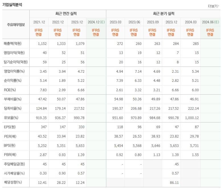 최근 3년 기업 실적을 보면, 매출액은 2022년에 최고액을 찍엇고, 영업이익 및 당기순이익은 매년 변동성을 보여주고 있습니다. 올해 1분기 실적을 보면, 전년 1분기 대비 매출액 및 영업이익은 증가하였지만, 당기순이익은 감소한 모습을 보여줬습니다.
