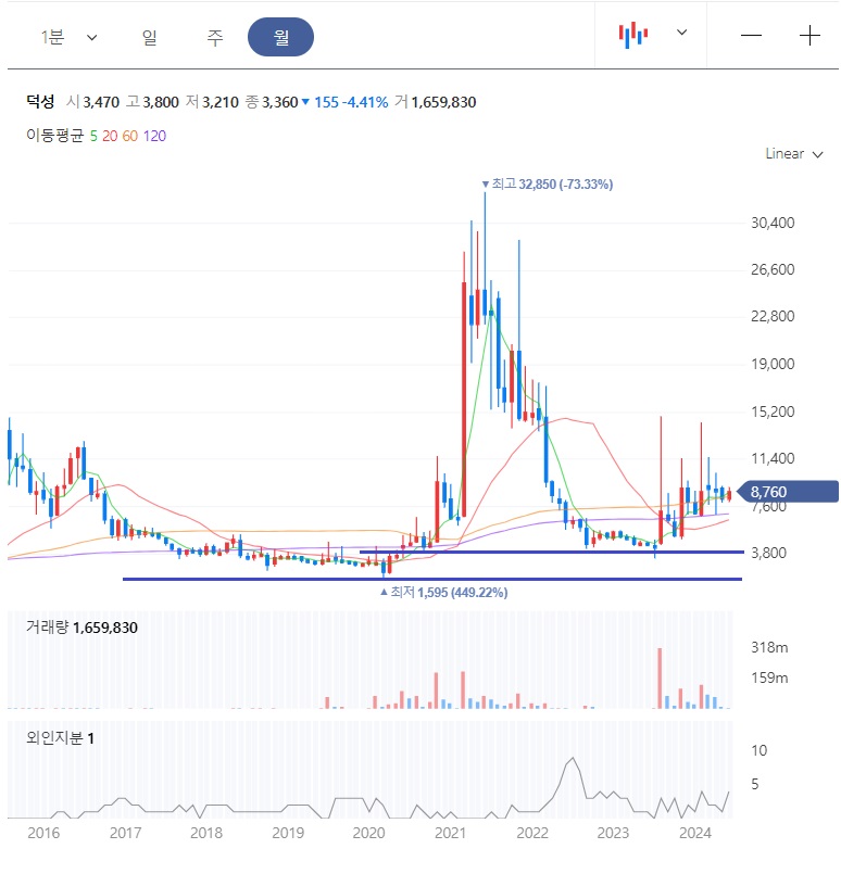 2020년에 저점 1,595원을 찍고는 상승추세가 이어지면서, 2021년에는 급등으로 최고점 32,850원을 찍고는 2023년까지 상승폭을 모두 반납하면서 하락추세를 보여줬습니다.