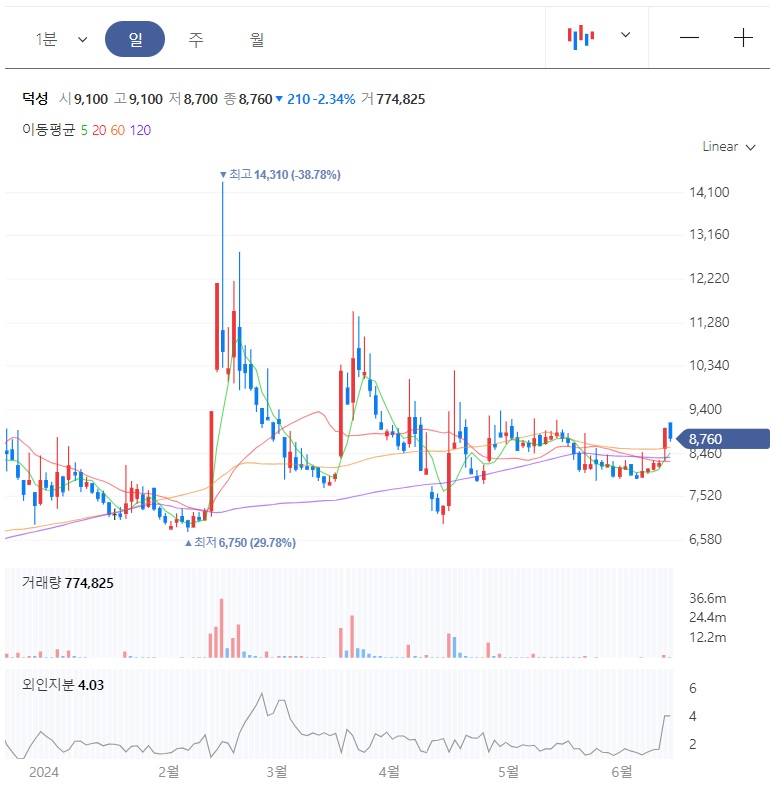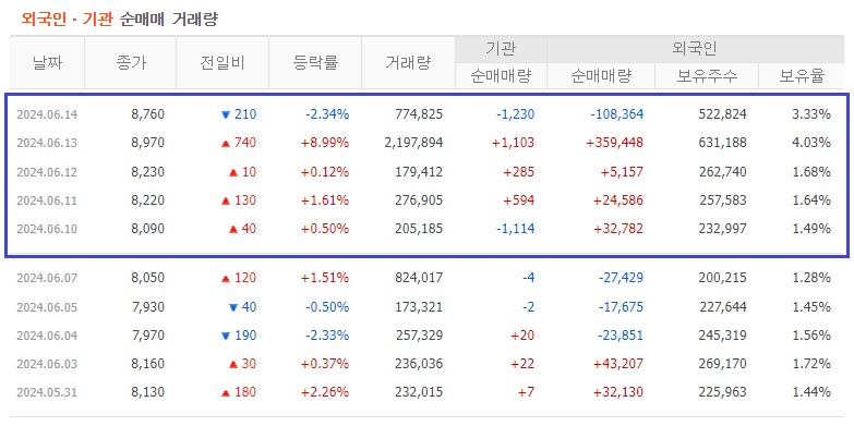 거래량이 잠잠했었는데, 6월 13일에 거래량이 219만주가 나오면서 활발한 모습으로 전환 되었습니다. 외국인 매수세가 유입되고 있습니다.