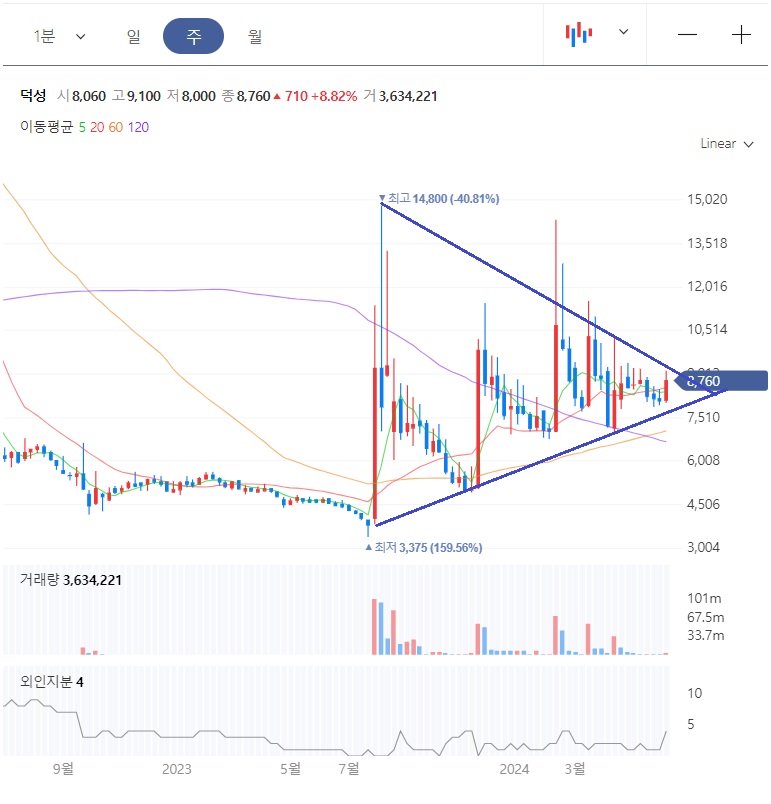 2023년 7월에 저점 3,375원을 찍고는 급반등하면서 고점 14,800원까지 상승했다가, 저점은 높이고 고점은 낮추면서 횡보구간을 보여주고 있습니다.