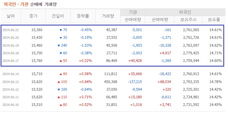 올해 1월에 저점 15,000원을 찍고는 급반등을 보여주면서, 고점 17,760원을 찍고는 다시 상승폭 반납을 하면서 박스권 장세를 보여주고 있습니다.