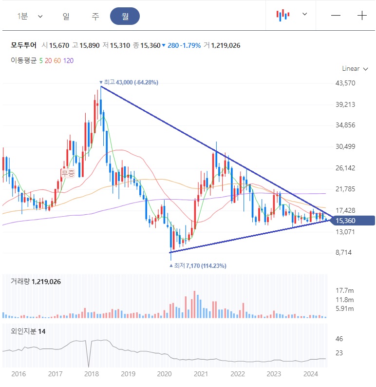 고점은 낮아지고, 저점은 높아지는 모습을 보여주고 있고, 월봉 20일선 및 60일선이 수렴 구간 입니다.