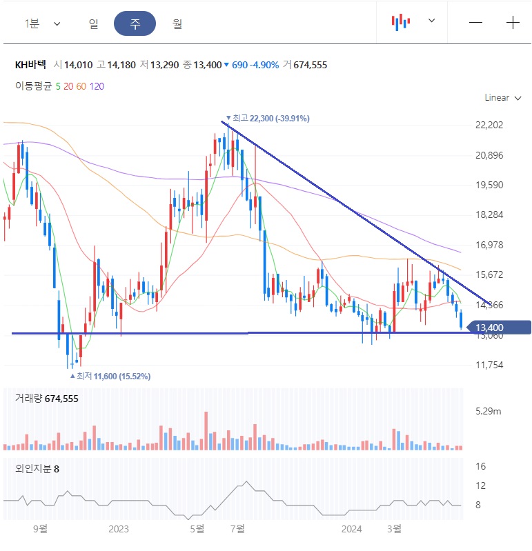 2022년 9월에 저점 11,600원을 찍고는 추세 상승반전 하면서, 상승세를 보여주면서 2023년 7월에 고점 22,300원을 찍고는 하락반전 이후에 지금까지 하락추세를 이어가고 있습니다.