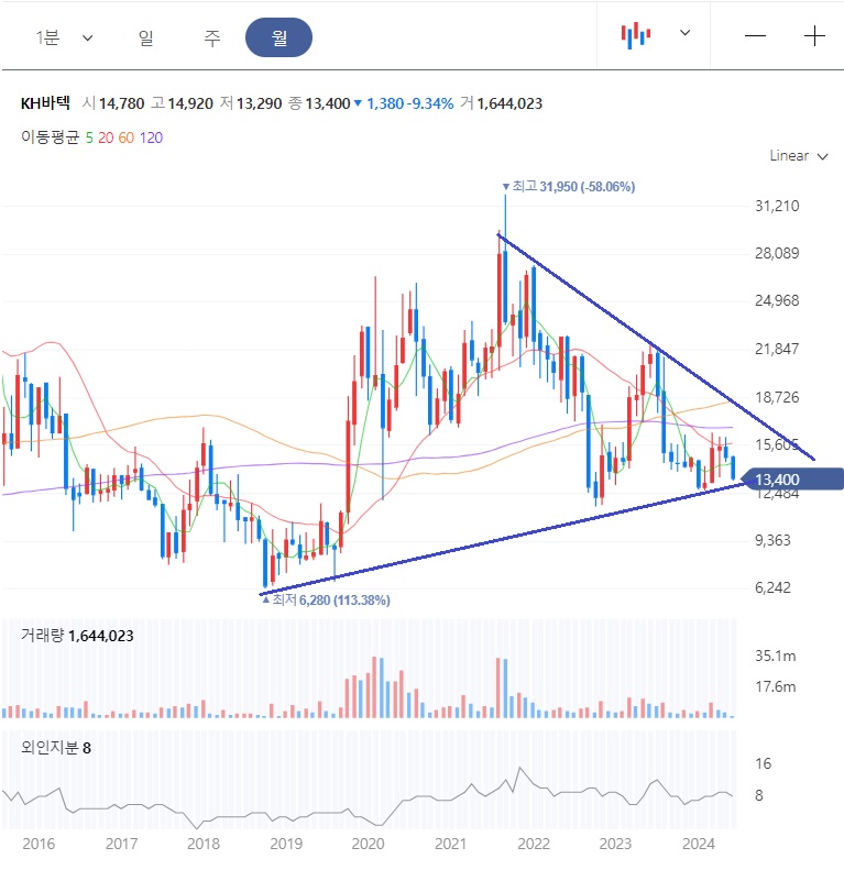 2018년에 저점 6,280원을 찍고는, 주가가 상승추세를 보여줬다가 2021년에 고점 31,950원을 찍고 하락반전 하였습니다.