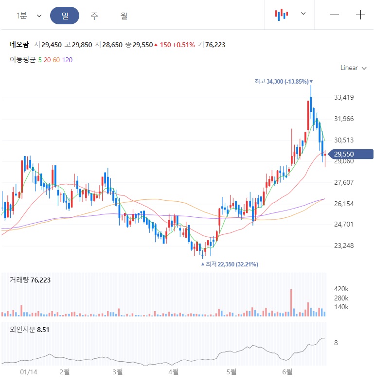 4월에 저점 22,350원을 찍고는, 상승 추세 전환 이후에 급상승세를 보여주다가, 6월에 고점 34,300원을 찍고는 지금까지 조정을 보여주고 있습니다. 일봉 20일선을 타고 상승추세를 보여줬던 만큼, 일봉 20일선에서 지지를 받으면 추세를 이어가게 되고, 이탈하면 추가 조정 이후에 반등이 나오게 됩니다.