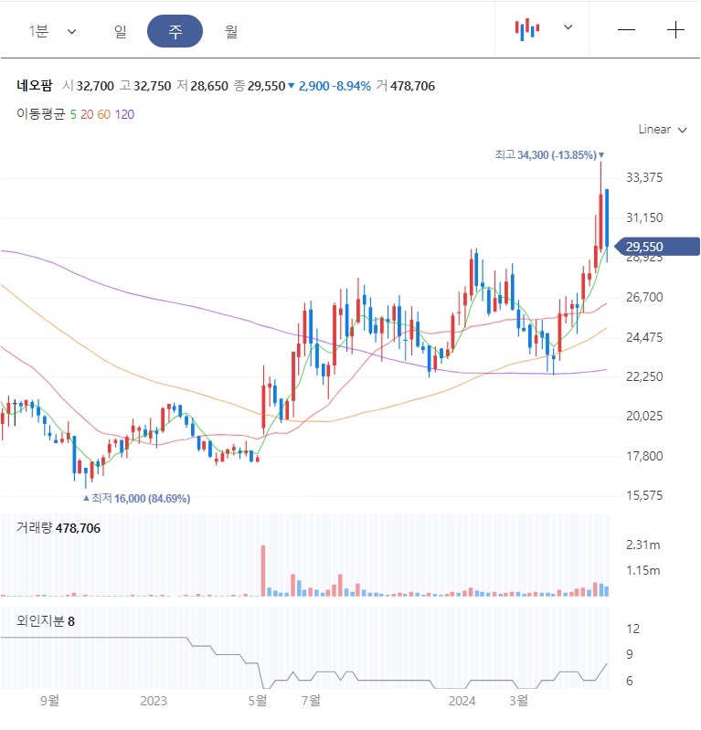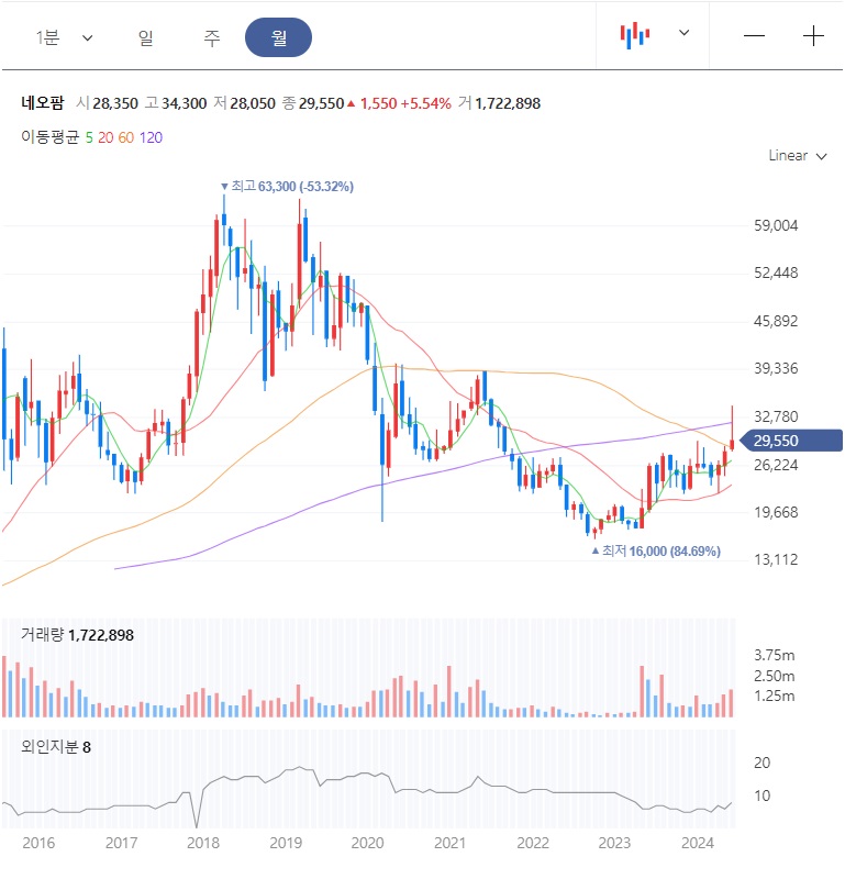 2018년에 최고점 63,300원을 찍고는 주가가 5년동안 하락조정을 받았습니다. 2022년 저점 16,000원을 찍고나서야 반등 구간이 나오면서 추세 상승을 만들어 가고 있습니다.