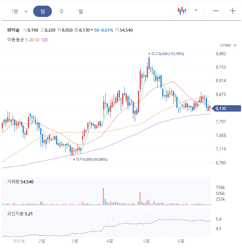 3월에 저점 6,950원을 찍고는 저점을 높이면서 주가가 우상향 보여주고 있습니다. 일봉 120일선이 저항선이 상승추세를 보여주고 있고, 추세선으로 지지 구간 입니다.