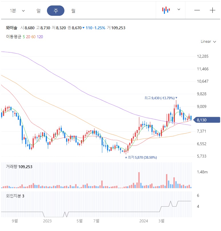 2022년 하반기부터 저점 구간에서 횡보구간을 보냈었고, 그 사이에 주봉 20일선 및 60일선이 저점 구간까지 내려왔습니다. 그러다가, 올해 작년 하반기에 저점 5,870원을 찍고 반등이 나와줬고, 주봉 20일선 및 60일선이 수렴구간에 진입할때 반등이 나와줬습니다.