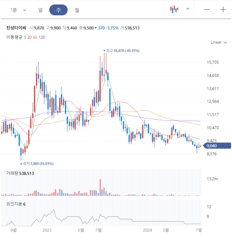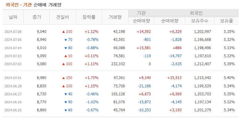 2022년 하반기에 저점 7,860원을 찍고는 급반등 하는 모습을 보여주면서, 2023년 7월에 고점 16,470원까지 상승을 보여줬었습니다. 그 이후에 상승폭 모두 반납하면서, 다시 전저점 부근까지 조정을 받고 있습니다. 지지를 받아야 하는 자리이기에, 매수세가 유입되어야 하고, 그러기 위해서는 거래량이 동반되어야 합니다.