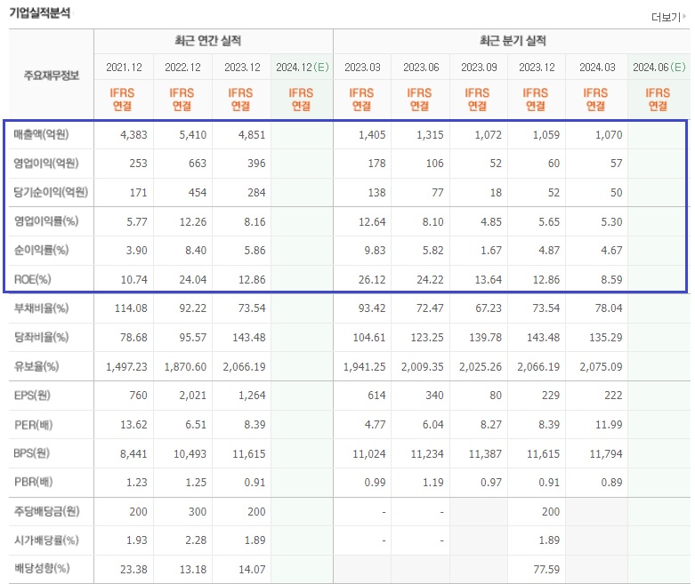최근 3년 실적을 보면, 2022년에 매출액 정점을 찍고는 2023년에 감소하는 모습을 보여줬고, 영업이익 및 당기순이익도 크게 감소하는 모습을 보여줬습니다.