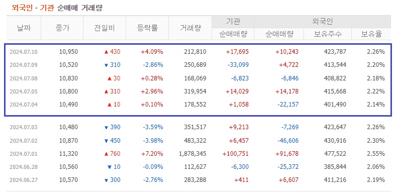 완연한 하락추세를 보여주다가, 올해 5월에 저점 8,840원을 찍고는 반등추세로 전환하였고, 현재 일봉 120일선 저항선 돌파 이후에 지지구간을 보내고 있습니다.