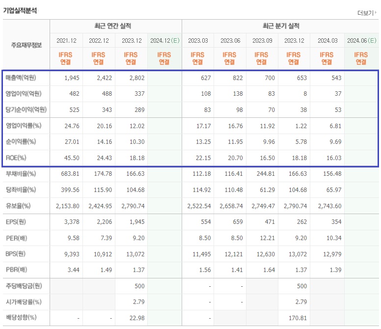 최근 3년 실적을 보면, 매출액이 점차적으로 증가하고 있지만, 영업이익 및 당기순이익은 감소하는 모습을 보여주고 있습니다. 영업이익률 및 순이익률이 매년 감소함을 확인할수 있습니다.